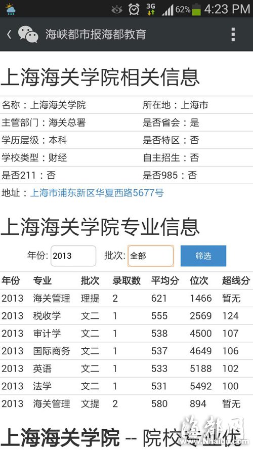例如,在微信版“海都高招金手冊(cè)”的“高校信息”欄目中,查詢“上海海關(guān)學(xué)院”可知,該校2013年文二批次錄取平均分最高的專業(yè)是稅收學(xué),555分的分?jǐn)?shù),不但超過(guò)當(dāng)年本二線124分,也超過(guò)本一線42分(如圖3)。