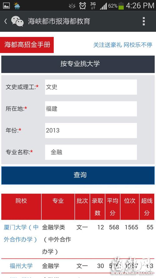 為方便考生查詢,微信版“海都高招金手冊(cè)”,有本二批招生的所有院校各專業(yè)的錄取平均分,以及錄取平均分的超線分?jǐn)?shù)。無(wú)論考生是選省內(nèi)省外哪個(gè)地域的高校,只需查詢相應(yīng)省份就能把目標(biāo)一網(wǎng)打盡。