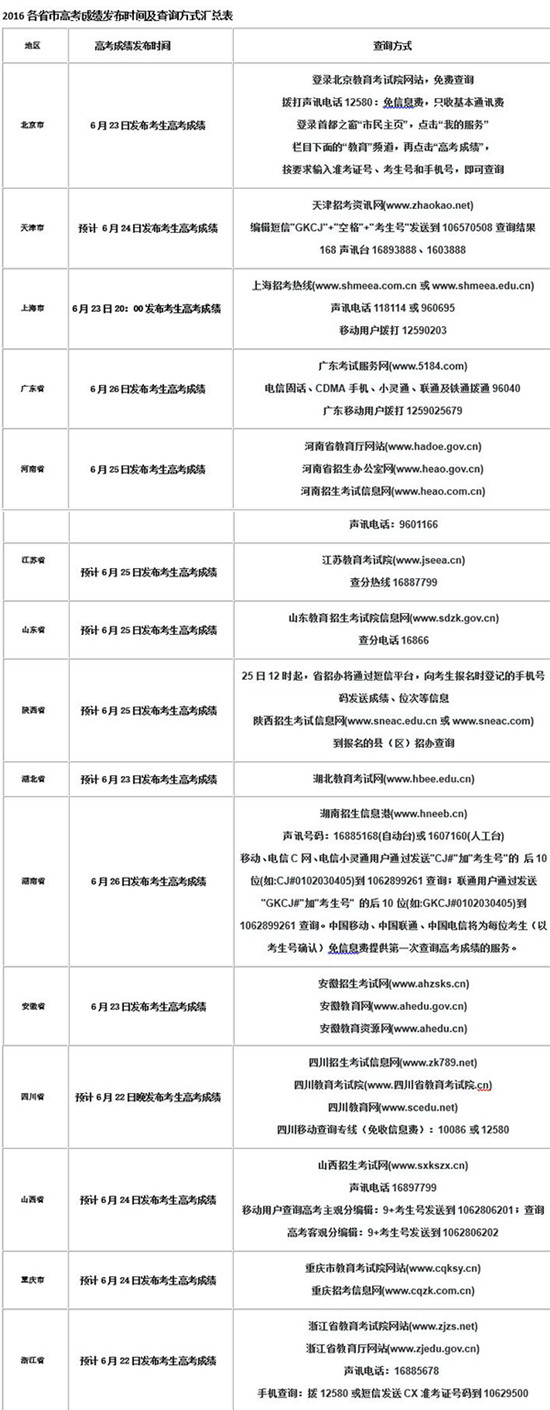 根據各地教育部門官網數據,記者發現,各地高考成績查詢方式與往年基本相同。成績正式公布之后,各省份的教育考試官網會提供在線免費查分服務,各地官方公布的聲訊電話也可查詢高考分數,部分省份提供短信查分服務。