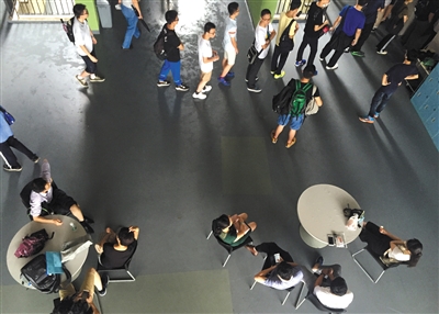 新京報記者注意到,一般的高校里貼滿了公務員招考培訓、英語四六級培訓廣告海報,而南方科技大學僅有的廣告就是學生食堂里的留學廣告海報。